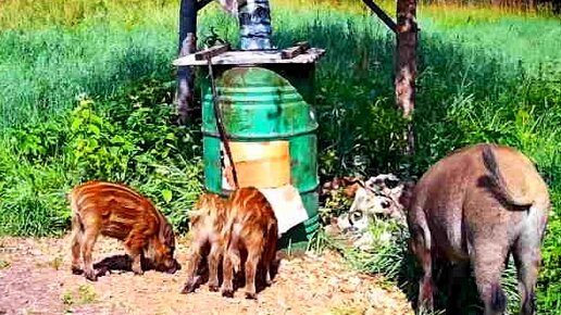 Дикие кабаны на кормушке.