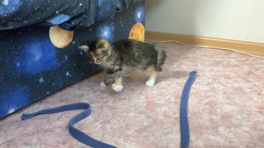 Котёнок Сэнди играет со шнурком