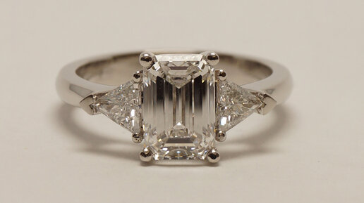 Шикарное кольцо с центральным бриллиантом огранки "изумруд" 2,02 карата и двумя бриллиантами треугольной огранки.