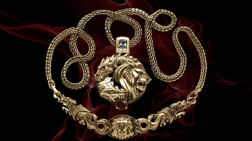 Танец Льва и Дракона. Авторское колье в технике обронного гравирования. Золото, рубин, сапфир. Ювелир Игорь Орлов