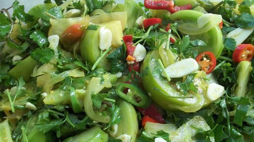 Потрясающий вкусный салат из зеленых помидор на зиму.