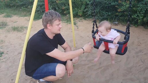 Малыш первый раз катается на качели. Радости полные штаны