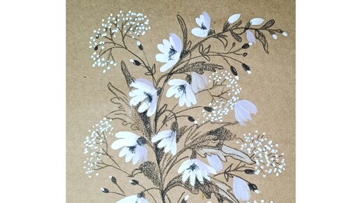 Цветы нарисованные белой гуашью и угольным карандашом на крафтовой бумаге.