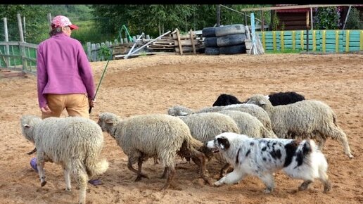 Пастушья работа австралийской овчарки с небольшим стадом овец
