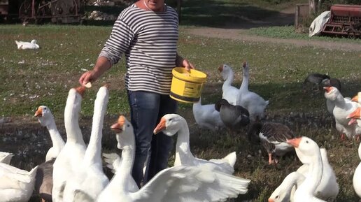 Гуси Анатолия Тихонова едят с руки. Экспедиция по гусеводческим хозяйствам №2.