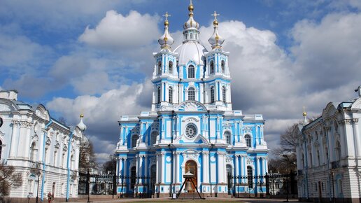 Смольный Воскресенский собор и сад партер Смольного. Санкт Петербург. Сентябрь, 2020 года.