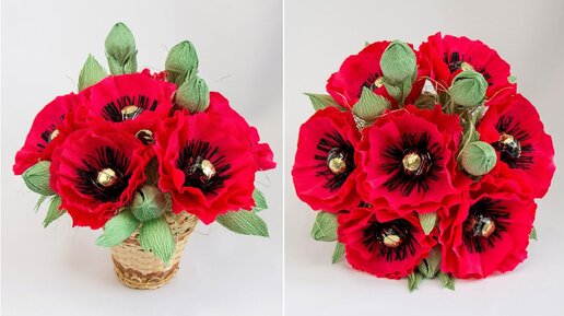 Букет из конфет. Маки из гофрированной бумаги своими руками. Летние подарки и поделки