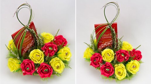 Идея упаковки коробки конфет. Композиция с цветами из конфет на 8 марта.