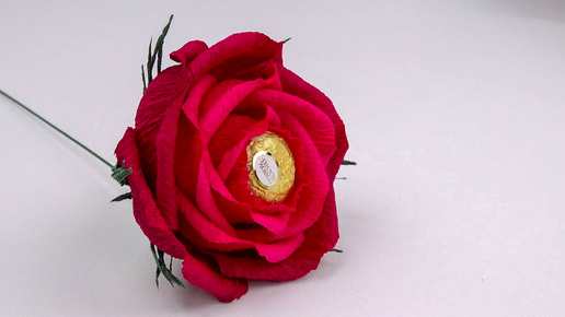 Как сделать бумажную розу с конфетой из гофрированной бумаги своими руками.