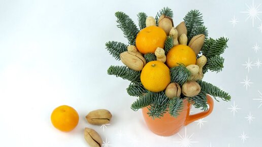Букет из мандаринов и орехов в кружке. Мини букет из еды на Новый Год и Рождество