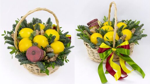 Букет из фруктов в корзине своими руками. Берем мед, лимоны и имбирь и делаем красивые подарки