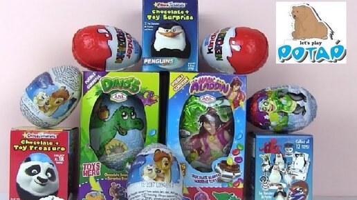 Киндер Сюрпризы. Яйца Алладин, Кунг Фу Панда, Динозаврик, Пингвины, Машинки