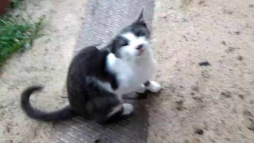Серый котик хочет, чтоб его погладили и поиграли с ним