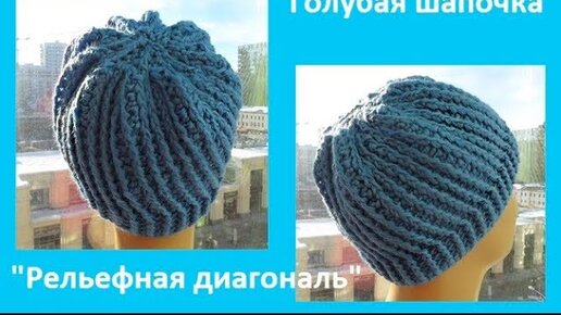 Голубая шапочка Рельефная диагональкрючком , crochet hat(шапки № 113)