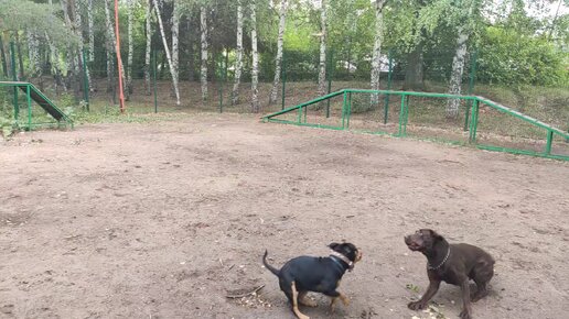 Кусачий блог. Английский стаффордширский бультерьер и лабрадор. Щенячьи игры на площадке для собак