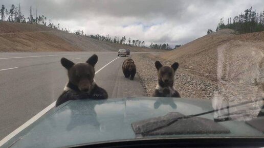 Медведи выпрашивают еду у водителей в Якутии — видео