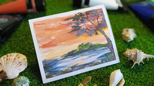 Закат и дерево с камнями в несколько мазков