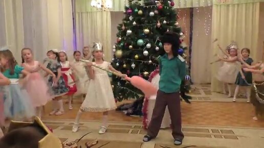 Снежная баба и дворник. Дети 5, 6 и 7 лет танцуют танец в детском саду.