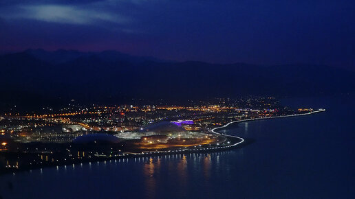 Ночная посадка в Сочи с видом на Олимпийский парк