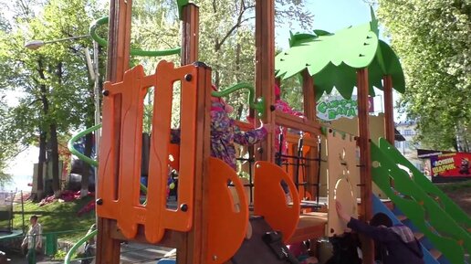 Дети катаются с горки, качаются на качелях на детской площадке в Летнем саду Ижевска.