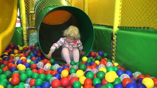 Лиза играет, прыгает на батуте, катается с горки в сухой бассейн с шариками. Детский лабиринт.