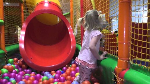 Детский лабиринт: дети катаются с горки. Бассейн с шариками, батут.