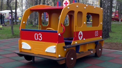 Дети играют на детской площадке, катаются на детских каруселях и аттракционах.