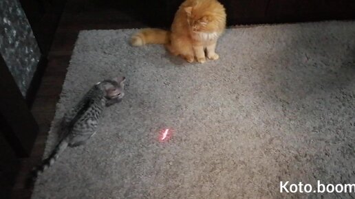 Кошки по разному играют в указку, маленькая шустрая, а взрослый еле хвост передвигает