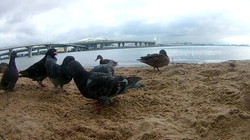 Санкт-Петербург. Голуби чайки воробьи утки на финском заливе напротив Зенит Арена