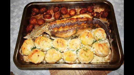 Стерлядь, запеченная в духовке (с картошкой и шампиньонами)