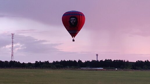 Воздушный шар с Че Геварой низко летает над полем и домами в Подмосковье