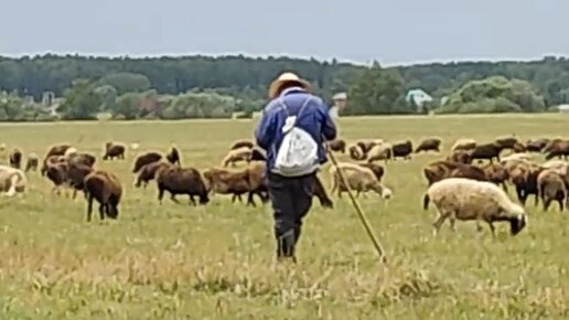 Пастух следит за стадом пасущихся баранов на поле