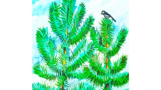 Птичка на сосне - рисунок красками.