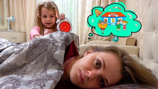 Ева и мама сонные играют вместе веселятся и Проспали в садик