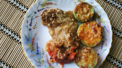 Филе минтая, запечённое с цукини и томатом, под сыром