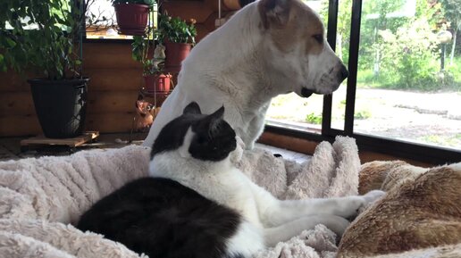 Алабай пришёл к коту, который сладко спал