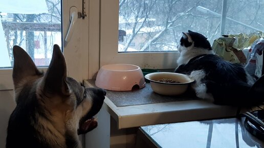 Пес, кот и голубь. Кошак следит за голубем на балконе, а пес следит за кошаком, не понимая, чего тому надо