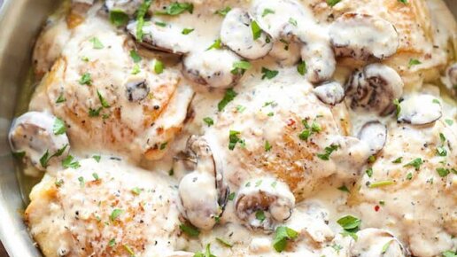 Короткий видео рецепт курицы на сковороде. Курица с грибами и луком в сливочном соусе.