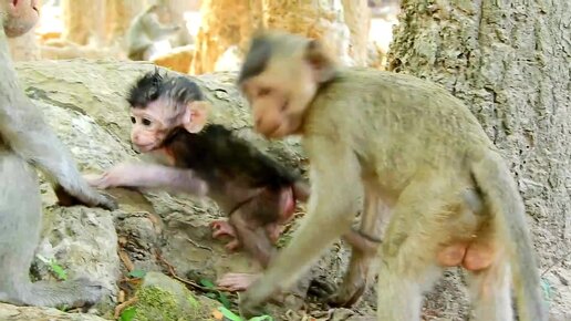 Недавно рождённая обезьянка интересует всё,старшая сестра всегда рядом