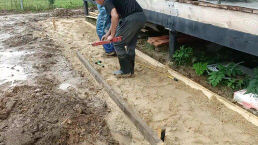 Отсыпка песком основания под отмостку. Монтаж опалубки
