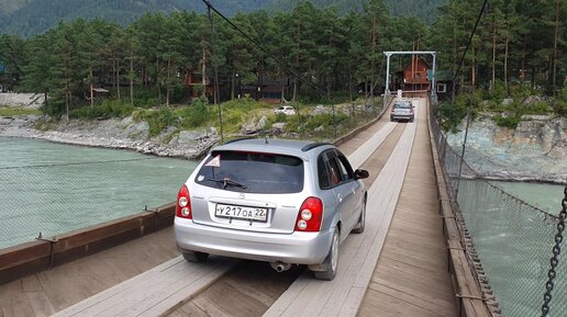 Горный Алтай, подвесной мост с видом на Зубы Дракона