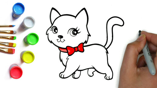 Как нарисовать красивую и милую кошку с красной бабочкой, лёгкие рисунки и раскраски для детей