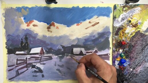 Нарисовал горный, зимний пейзаж, показываю процесс создания с палитрой