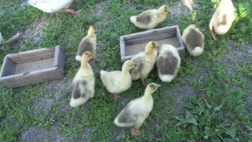 Гошины колобочки-гусята подрастают! Инкубаторские гусята ходят рядом с ними.