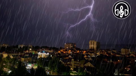 Звуки дождя с раскатами грома с видом из окна города
