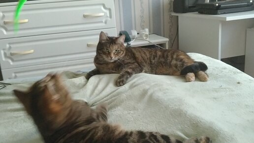 Кошки едят зелёного червяка.