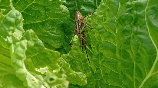 Лето 2021. На большой пекинской капусте - вырос большой кузнечик