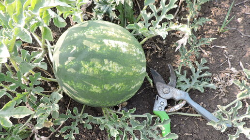 Арбузы, дыни, тыква на моем бахчевом участке. Срезала первый поспевший арбуз.