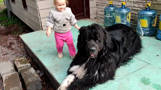 Малышка пытается забраться на огромную собаку