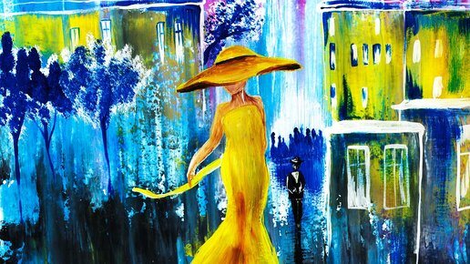 Интерьерная картина. Рисуем Девушку в шляпе. Дама в городе красками. Рисуем вечерний город.